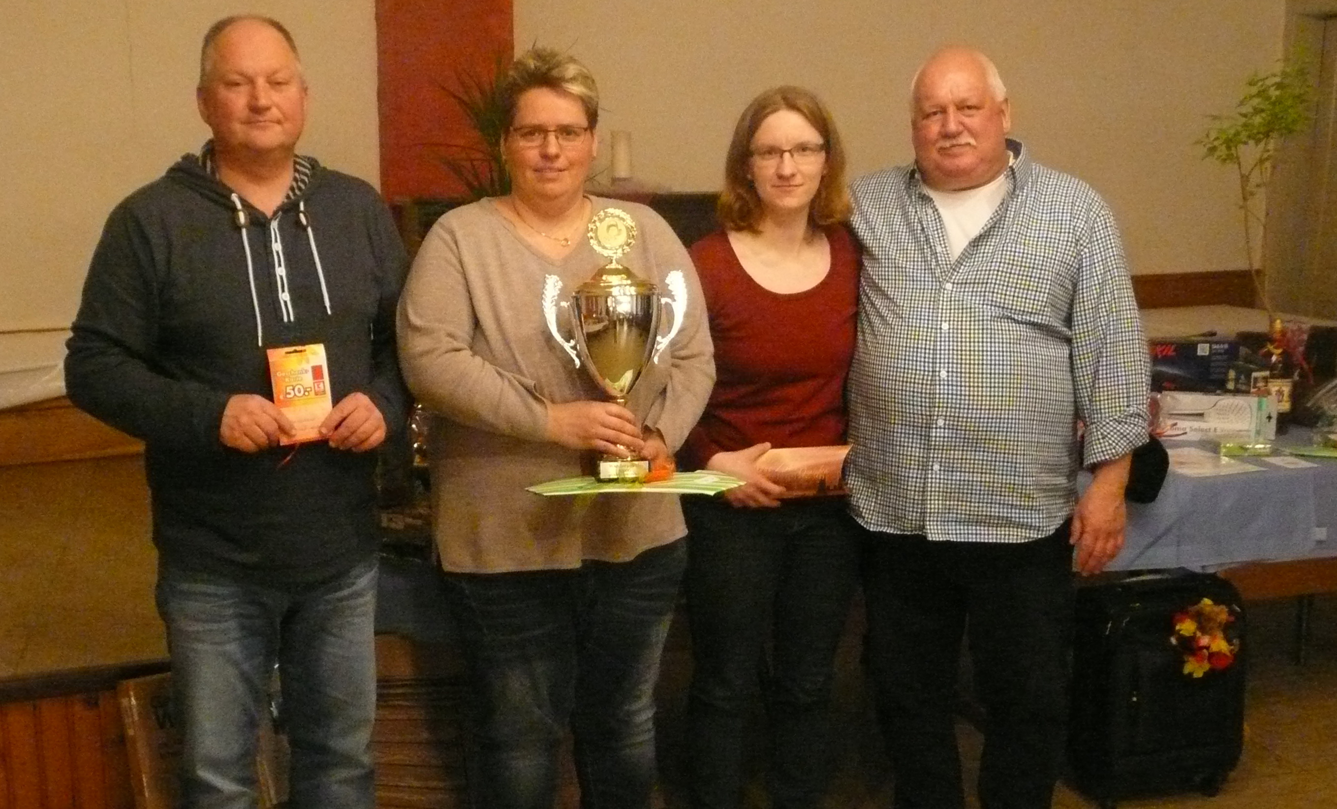 Beim diesjährigen Knobelabend des SV Rot-Weiß Hörden gab es eine klare Siegerin um den Wanderpokal und die begehrten Preise. Sonja Kleimann gewann mit sehr guten 38.400 Punkten den Pokal und einen Gutschein von der Raiffeisen-Warengenossenschaft. Den 2. Platz erspielte sich mit 36.750 Punkten der 2. Vorsitzende Stephan Kleimann, Dritte wurde mit 36.000 Punkten Clarissa Grüneberg. Attraktive Preise, dank der Sponsoren und ein Essen nach der 1. Runde sorgten für eine gute Stimmung und einen schönen Abend. Zur Freude des Wanderpokal-Stifters Andreas